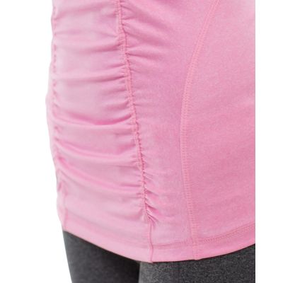 The Iris Workout Top is sleeveless, body fitting and moisture wicking for a fashionable, functional garment. Rouched textures add style.